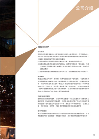 %u516c%u53f8%u4ecb%u7d39%u6838%u5fc3%u80fd%u529b%u7814%u88fd%u751f%u7522%u5404%u7a2e%u7522%u696d%u9285%u5408%u91d1%u6750%u8cea%u53ca%u9ad8%u7cbe%u5ea6%u7684%u9285%u5408%u91d1%u9444%u9020%u96f6%u914d%u4ef6%uff0c%u7b26%u5408%u570b%u969bJIS%u3001ASTM%u53ca%u5176%u4ed6%u5148%u9032%u570b%u5bb6%u54c1%u8cea%u6a19%u6e96%uff0c%u63d0%u4f9b%u5404%u7a2e%u7522%u696d%u8207%u6a5f%u5668%u914d%u4ef6%u505a%u5b8c%u7f8e%u7d44%u5408%u642d%u914d%uff0c%u5927%u5e45%u63d0%u5347%u6a5f%u5668%u54c1%u8cea%u53ca%u6574%u9ad4%u7522%u54c1%u7684%u9644%u52a0%u50f9%u503c%u3002(%u4e00)%u5c0d%u65bc%u9444%u9020%u54c1%uff0c%u6700%u5927%u55ae%u4e00%u9444%u4ef6%u53ef%u91cd%u905410%u516c%u5678%uff0c%u5c55%u73fe%u512a%u8cea%u7684%u88fd%u9020%u5be6%u529b%u3002(%u4e8c)%u96e2%u5fc3%u9444%u9020%u54c1%u6709%u6c96%u5e8a%u53ca%u5c04%u51fa%u6a5f%u7684%u9285%u88fd%u54c1%u3001%u9ad8%u5c0e%u96fb%u6027%u8cea%u7d05%u9285%u3001%u96fb%u68af%u9f52%u8f2a%u3001IT%u7522%u696d%u7528%u9285%u53ca%u5176%u4ed6%u6a5f%u68b0%u5957%u9285%u3001%u9f52%u8f2a%u7b49%uff0c%u7522%u54c1%u53ca%u7ba1%u6750%uff0c%u63d0%u4f9b%u5ba2%u6236%u5b8c%u6574%u3001%u591a%u6a23%u5316%u7684%u9285%u88fd%u54c1%u9700%u6c42%u3002(%u4e09)%u5c0d%u65bc%u8239%u8236%u985e%u7522%u54c1%u7d2f%u7a4d%u7121%u6578%u500b%u54c1%u8cea%u6539%u826f%u65b9%u6cd5%uff0c%u80fd%u6301%u7e8c%u7a69%u5b9a%u63d0%u4f9b%u5ba2%u6236%u7684%u8981%u6c42%u3002%u7af6%u722d%u512a%u52e2%u96e2(%u9060)%u5fc3%u9444%u9020%u54c1%u5982%u6c96%u5e8a%u3001%u5c04%u51fa%u6a5f%u3001%u9ad8%u5c0e%u96fb%u6027%u8cea%u7d05%u9285%u3001%u96fb%u68af%u9f52%u8f38%u3001IT%u7522%u696d%u7528%u9285%u53ca%u5176%u4ed6%u6a5f%u68b0%u5957%u9285%u3001%u9f52%u8f2a%u7b49%uff0c%u7522%u54c1%u53ca%u7ba1%u6750%u5099%u6599%u5145%u8db3%uff0c%u63d0%u4f9b%u5ba2%u6236%u591a%u6a23%u3001%u5feb%u901f%u7684%u7522%u54c1%u670d%u52d9%u3002%u76ee%u524d%u5167%u5916%u92b7%u6bd4%u7387%u70ba%u4e09%u6bd4%u4e03%uff0c%u96e2(%u9060)%u5fc3%u9444%u9020%u9285%u5408%u91d1%u90e8%u54c1%u63d0%u4f9b%u7d66%u65e5%u672c%u6c96%u5e8a%u5927%u5ee0AIDA%u516c%u53f8%u3001%u5c0f%u677e%u516c%u53f8%uff0c%u5c04%u51fa%u6a5f%u5927%u5ee0%u5982%u6771%u829d%u5ee0%u3001%u5b87%u90e8(UBE)%u3001%u65b0%u7009(NIGATA)%u7b49%uff1b%u570b%u5167%u5982%u91d1%u8c50%u6a5f%u5668%u53ca%u5168%u7acb%u767c%u516c%u53f8%u7b49%u5927%u5ee0%u4f7f%u7528%uff0c%u4ea6%u70ba%u4e2d%u92fc%u570b%u5167%u9285%u5408%u91d1%u9444%u4ef6%u5408%u683c%u4f9b%u61c9%u5546%u3002%u5728%u5b97%u6559%u7528%u54c1%u65b9%u9762%uff0c%u70ba%u552f%u4e00%u5c08%u9580%u9285%u9418%u9444%u9020%u5ee0%u3002%u6301%u7e8c%u6027%u7684%u7af6%u722d%u512a%u52e2%u570b%u969b%u8f2a%u8239%u4e4b%u8239%u8eab%u5c07%u505a%u8b8a%u66f4%uff0c%u65e5%u5f8c%u5c07%u4fee%u6539%u70ba%u96d9%u5c64%uff0c%u4ee5%u9632%u6b62%u78b0%u649e%u6f0f%u6cb9%uff0c%u56e0%u61c9%u4e16%u754c%u5de5%u5ee0%u7684%u8f49%u79fb%uff0c%u6240%u4ee5%u65b0%u8239%u88fd%u4f5c%u6301%u7e8c%u6210%u9577%uff0c%u76ee%u524d%u672c%u516c%u53f8%u6700%u5927%u7684%u5ba2%u6236%u4ecd%u70ba%u65e5%u672c%u7684%u8239%u7528%u6cf5%u6d66%u88fd%u9020%u5ee0%uff0c%u5ba2%u6236%u9020%u8239%u8a02%u55ae%u5df2%u63a5%u81f32014%u5e74%uff0c%u9810%u4f30%u81f32016%u5e74%u4ecd%u5c07%u770b%u597d%u3002%u5728%u7522%u54c1%u65b9%u9762%uff0c%u5c0d%u65bc%u65b0%u7522%u54c1%u3001%u65b0%u8981%u6c42%uff0c%u6301%u7e8c%u4e00%u8cab%u7684%u958b%u767c%u65b0%u751f%u7522%u6280%u8853%u53ca%u54c1%u8cea%u63a7%u7ba1%u3002%u7af6%u722d%u529b%u7684%u63d0%u5347%u5c08%u6ce8%u3001%u6301%u7e8c%u4fee%u6b63%u7d93%u71df%u7b56%u7565%u8207%u65b9%u5411%uff0c%u4e0d%u65b7%u7684%u751f%u7522%u6280%u8853%u7814%u767c%u4e26%u5782%u76f4%u6574%u5408%u6280%u8853%u3001 %u6210%u529f%u5e36%u52d5%u7522%u696d%u5347%u7d1a%uff0c%u5f37%u5316%u6574%u5ee0%u4e00%u689d%u9f8d%u5168%u81ea%u88fd%u80fd%u529b%uff0c%u5145%u5206%u638c%u63e1%u88fd%u7a0b%u54c1%u8cea%u8207%u964d%u4f4e%u6210%u672c%u3002%u570b%u969b%u7af6%u722d%u529b02